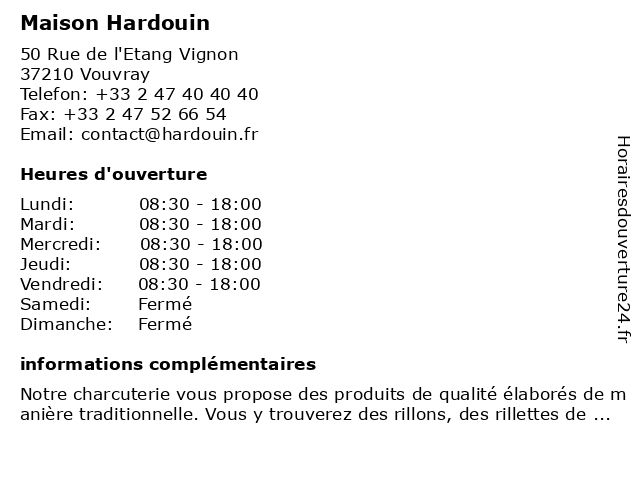 1 Hardouin le Charcutier (Distance: 2,39 km) 8 Rue de la République, 37210 Vouvray charcutier, hardouin, le 2 Hardouin Le Charcutier (Distance: 2,60 km) 25 Route Nationale 152, 37210 Vouvray charcutier, hardouin, le 3 Hardouin Le Charcutier - Le Virage Gastronomique (Distance: 5,31 km) 25 route D952, 37210 Vouvray charcuterie, charcutier, gastronomique, hardouin, le, viande, virage 4 EHPAD - Résidence François Hardouin (Distance: 8,42 km) 24 rue François Hardouin, 37100 Tours ehpad, foyer, françois, hardouin, hébergement, retraite, résidence, soins 6 |