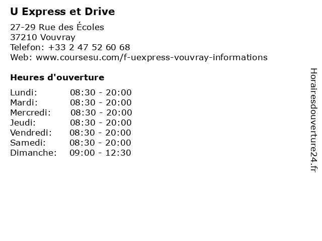 3 E.Leclerc Drive (Distance: 2,19 km) . Rue Marie de Lorraine, 37700 La Ville-aux-Dames discount, drive, e.leclerc, marché, supermarché 4 Coccinelle Express (Distance: 3,44 km) 1 Allée des Ralluères, 37270 Montlouis-sur-Loire accessibilité, bio, choix varié, coccinelle, coccinelle express, commerce local, courses du quotidien, courses rapides, express, fruits et légumes, prix accessibles, produits frais, promotions, proximité, qualité, rapidité, épicerie pratique 5 Super U et Drive (Distance: 3,52 km) 25 Rue du Professeur Debré, 37210 Vernou-sur-Brenne drive, et, super 6 Carrrefour Drive (Distance: 5,79 km) . Avenue Jacques Duclos, 37700 Saint Pierre des Corps atlantes, carrrefour, centre, commercial, corps, des, drive, les, pierre, saint |