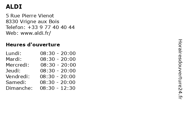1 Aldi (Distance: 0,00 km) 5 Rue Pierre Viénot, 08330 Vrigne-aux-Bois aldi, alimentaire, alimentation, supermarché, supérette, épicerie 2 ALDI (Distance: 6,57 km) 22 Avenue de la Marne, 08200 Sedan aldi, aldi près de moi, courses près de moi, magasin, magasin discount, magasin discount près de moi, supermarché, supermarché près de moi, supermarchés, supermarchés près de moi, épicerie, épicerie près de chez moi 5 Aldi (Distance: 9,30 km) 50 avenue Charles de Gaulle, 08200 Balan aldi, alimentaire, alimentation, supermarché, supérette, épicerie 6 |