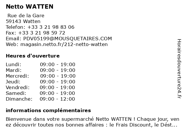 1 Netto (Distance: 0,08 km) - Rue de la Gare, 59143 Watten achats de produits alimentaires, des prix bas, grands supermarchés, hard discount, netto, supermarchés 3 Netto Campagne-les-Wardrecques (Distance: 15,29 km) 2 Rue Principale, 62120 Campagne-lès-Wardrecques campagne, les, netto, wardrecques 5 Netto Station Service (Distance: 31,17 km) - Rue Delcourt, 62330 Guarbecque carburant, essences, gazole, netto, service, services, station 6 |