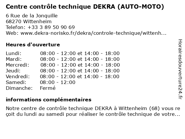 Description de l'entreprise :Préparer votre contrôle techniquePour préparer votre contrôle technique dans notre centre DEKRA de Wittenheim, vous pouvez vérifier en amont différents points comme les pneumatiques, la visibilité, le niveau d'huile ou encore l'habitacle. Pour tout savoir, consultez notre vidéo. Voir l'offre |