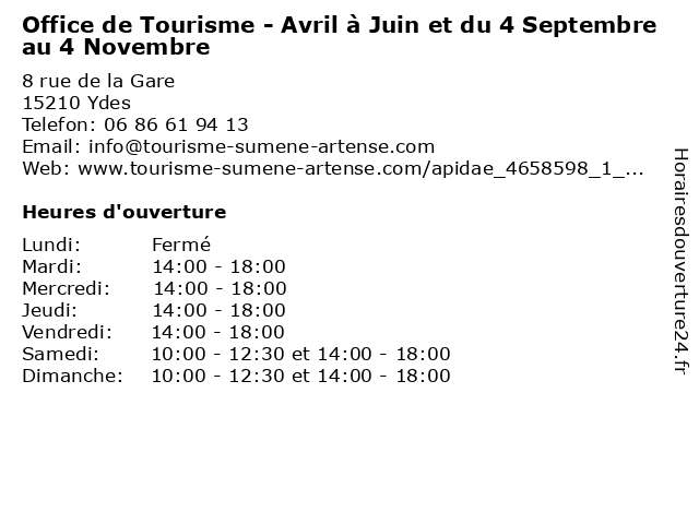 | Dimanche | 10:00-12:30 et 14:00-18:00 |