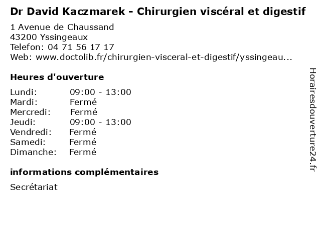 1 Dr Franck Maisonnette - Chirurgien viscéral et digestif (Distance: 0,00 km) 1 Avenue de Chaussand, 43200 Yssingeaux chirurgie, chirurgien, digestif, dr, et, franck, general, maisonnette, soins, viscéral 2 Dr Zouhair Benjelloun - Chirurgien viscéral et digestif (Distance: 0,27 km) 22 Place du Marché, 43200 Yssingeaux benjelloun, chirurgie, chirurgien, digestif, dr, et, general, soins, viscéral, zouhair 3 Auto-École David (Distance: 9,65 km) 9 Rue de la République, 43130 Retournac auto, auto école, code, cours, david, formation, permis, école 5 Confort Auto - David Pneus Services (Distance: 12,69 km) 5 impasse de La Plaine, 43260 Saint-Étienne-Lardeyrol atelier, auto, automobile, carrosserie, confort, controle, david, entretien, garage, montage, pneu, pneus, réparation, services 6 |