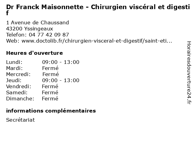 1 Dr David Kaczmarek - Chirurgien viscéral et digestif (Distance: 0,00 km) 1 Avenue de Chaussand, 43200 Yssingeaux chirurgie, chirurgien, david, digestif, dr, et, general, kaczmarek, soins, viscéral 2 Dr Zouhair Benjelloun - Chirurgien viscéral et digestif (Distance: 0,27 km) 22 Place du Marché, 43200 Yssingeaux benjelloun, chirurgie, chirurgien, digestif, dr, et, general, soins, viscéral, zouhair 5 Franck Janisset - JTTI Group (Distance: 16,36 km) 61 Avenue de la Gare, 43120 Monistrol-sur-Loire accessoires, cordons, franck, group, janisset, jtti, sangles, sas, tresses 6 |