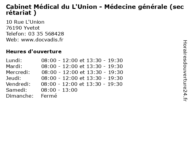 Termes de recherche pour Cabinet Médical du L'Union - Médecine générale (secrétariat ):du, l'union, cabinet, générale, medecine, santé, medical, secretariat, docteur, consultation |