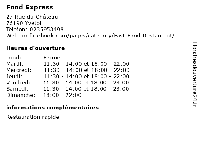 | Vendredi | 11:30-14:00 et 18:00-23:00 |