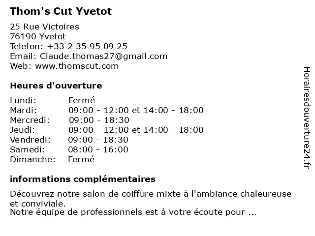 1 Cut'Hair (Distance: 25,78 km) 196 route de Dieppe, 76960 Notre Dame de Bondeville cut'hair, la beauté, le style, les soins 2 Coiffure Oliver's Cut (Distance: 30,87 km) 5 place du general leclerc, 76400 Fécamp cheveux, coiffeur, coiffure, cut, oliver's 3 Ben's Barber Shop (Distance: 31,10 km) 34 Rue des Bons Enfants, 76000 Rouen baber shop, barber, barbier, ben's, hair cut, homme, shop 4 31 Thirty One Cut (Distance: 36,51 km) 31 Rue De Thuit Hebert, 27520 Bourgtheroulde Infreville 31, cut, one, thirty |