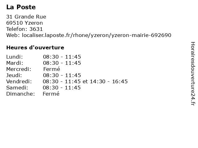 1 La Poste (Distance: 8,93 km) 1 Place des anciens combattants, 69290 Pollionnay la, la poste, pollionnay, poste 2 La Poste (Distance: 9,26 km) 1 Place francois durieux, 69510 Soucieu en jarrest la, la poste, poste, soucieu en jarrest 3 La Poste (Distance: 9,27 km) 406 Grande Rue, 69610 Sainte-Foy-l'Argentière agence, colis, courriers, expédition, la, postale, poste, relais 4 La Poste (Distance: 9,62 km) 506 Grande Rue, 69610 Les Halles agence postale, courrier postal, expédition internationale, la, poste 5 La Poste (Distance: 9,66 km) - Route Nationale 89, 24700 Moulin-Neuf agence, assurance, banque, banque postale, bureau de poste, chronopost, colis, courrier, dps, expéditions internationales, la, point, postale, poste, relais, timbres, téléphonie, ups, western union 6 |