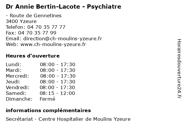 1 Dr Catherine Alexandre - Psychiatre (Distance: 0,00 km) - Route de Gennetines, 03400 Yzeure alexandre, catherine, consultation, docteur, dr, med, medecine, medical, médecin, psychiatre, traitement 2 Dr Véronique Audy - Psychiatre (Distance: 0,00 km) - Route de Gennetines, 03400 Yzeure audy, consultation, docteur, dr, med, medecine, medical, médecin, psychiatre, traitement, veronique, véronique 3 Dr Isabelle Bernhaupt-Harou - Psychiatre (Distance: 0,00 km) - Route de Gennetines, 03400 Yzeure bernhaupt, consultation, docteur, dr, harou, isabelle, med, medecine, medical, médecin, psychiatre, traitement 4 Dr Colette Nourry - Psychiatre (Distance: 0,00 km) - Route de Gennetines, 03400 Yzeure colette, consultation, docteur, dr, med, medecine, medical, médecin, nourry, psychiatre, traitement 5 Dr Véronique Terret - Psychiatre (Distance: 0,00 km) - Route de Gennetines, 03400 Yzeure consultation, docteur, dr, med, medecine, medical, médecin, psychiatre, terret, traitement, veronique, véronique 6 Dr Adlène Kara Hacene - Psychiatre (Distance: 1,04 km) 15 Rue du 4 Septembre, 03000 Moulins adlène, adlène kara hacene, bien-être, dr, hacene, kara, psychiatre, thérapie |